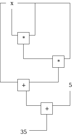 It's easy to see how this encodes the computation of . A prover with this circuit can produce a zkSNARK proof that convinces a verifier of a statement like "I have a secret number such that ", without revealing . This is a simple example so it's easy to find out that the number would be , but zkSNARKs enable complex protocols such as anonymous voting and payments where some elements of the computation remain secret.